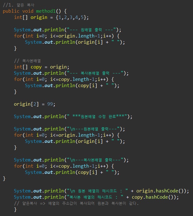 1. 얕은 복사(Shallow Copy) : 배열의 주소값만을 복사