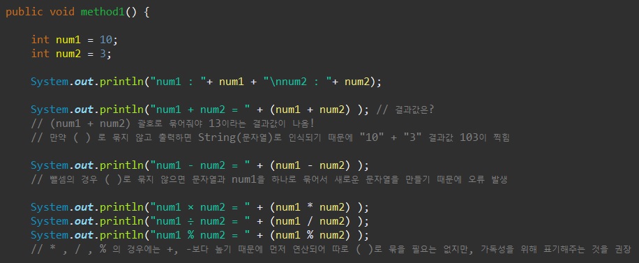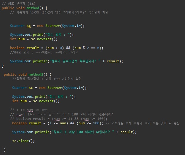 연산자(2) 논리 연산자 1. AND 연산자 (&&) 논리값 && 논리값 : 좌항과 우항의 값이 모두 true여야만 최종 결과가 true true && true => true true && false => false false && true => false false && false => false 2. OR 연산자 (||) 논리값 || 논리값 : 좌항 또는 우항의 값 중 하나라도 true이면 최종 결과가 true true && true => true true && false => true false && true => true false && false => false 삼항연산자 피연산자가 3개 => 값 3개와 연산자 1개로 이루어짐, 조건식 형식으로 쓰임 조건식 : 결과값에 따라서 연산을 처리하는 방..